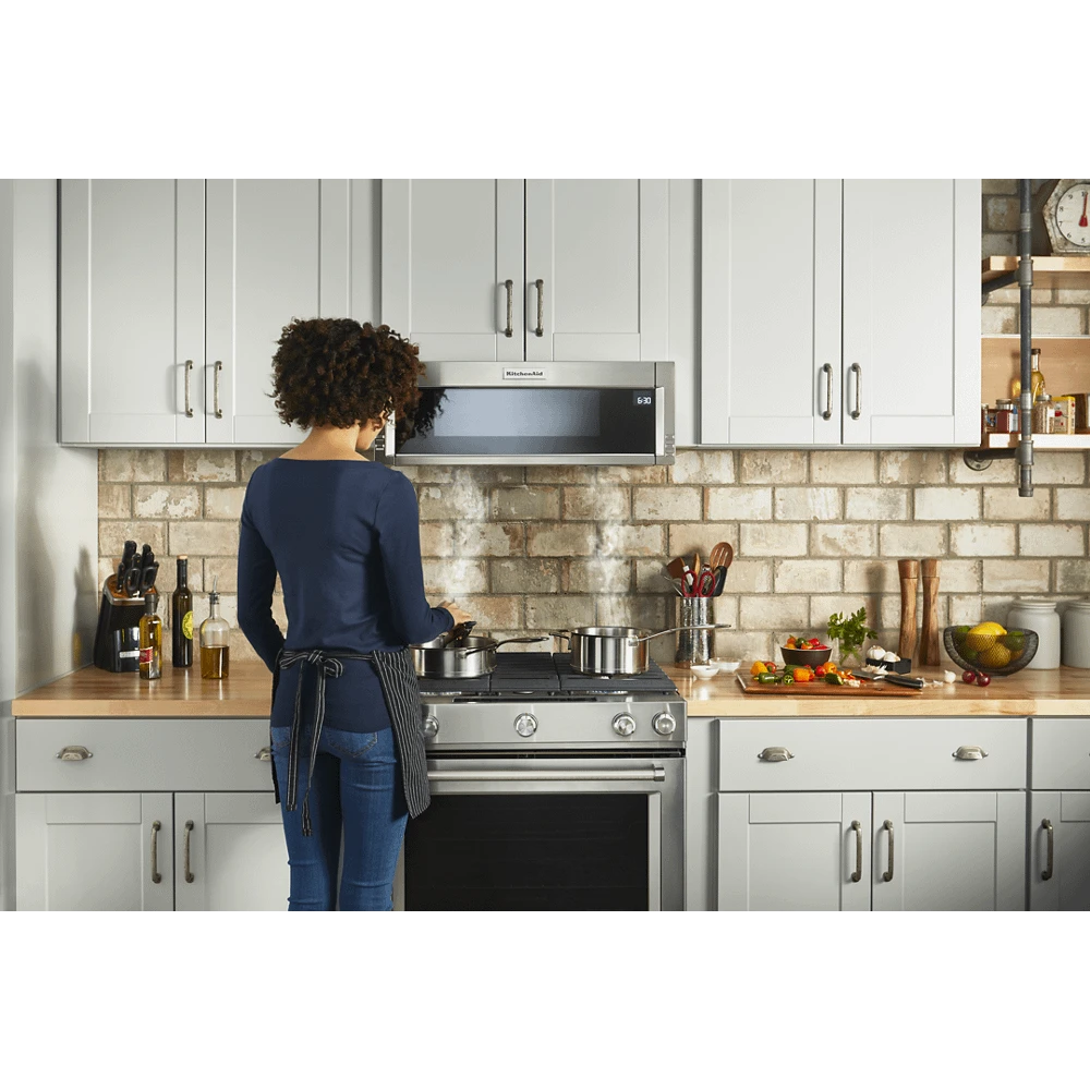 This innovative microwave hood combination gives cooks more room to create beneath its low profile cabinet, illuminated by dual LEDs. It delivers powerful ventilation coverage from two powerful 500 CFM Motor Class fans, capturing cooking smoke, grease and