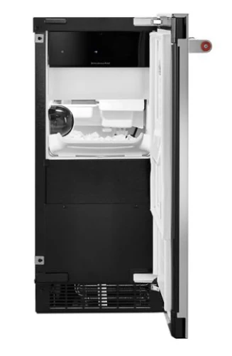 This 15″ automatic ice maker uses Clear Ice Technology to help produce cubes of uniform shape and clarity for every occasion. Distinctive styling makes it an appealing complement to other KitchenAid® appliances, with Fully Flush Installation for a built-in look. The signature handle design opens the door to reveal a storage bin that holds up to 25 pounds of ice.