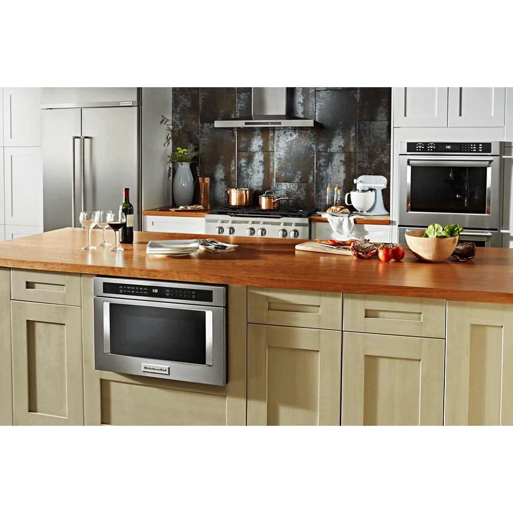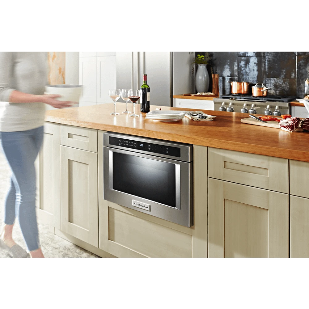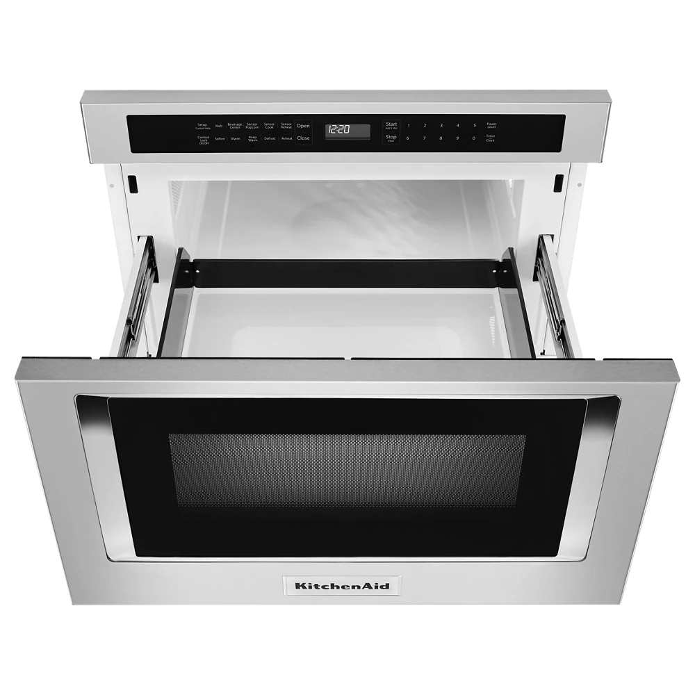 Give your kitchen more room for creativity with an ingenious top-loading microwave oven drawer that installs in your wall or island, saving you valuable countertop space for food preparation. Opening and closing the drawer are one-touch simple. Sensor cooking functions deliver precise control. 950 watt cooking power and 1.2 cu. ft. capacity handle a variety of foods with ease.