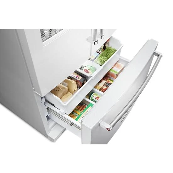 This 26.8 cu. ft. french door refrigerator helps fresh produce stay that way with the ExtendFresh™ Temperature Management System. A pull-out tray accommodates large platters with ease, while a FreshChill™ Temperature-Controlled Full-Width Pantry lets you optimize temperature and airflow for the specific food you’re storing. The refined interior design features LED lighting, and metallic accents add a touch of elegance.