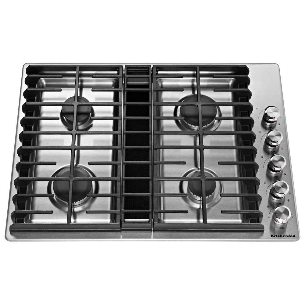 This 30 gas cooktop includes Downdraft, an integrated ventilation system that doesn t require a separate hood. The cooktop features a 17K BTU professional burner to achieve both high heat needed for searing and low simmer settings. The 5K BTU Even-Heat™ Simmer Burner enables precise simmering and melting while the 300 CFM exhaust rating means the venting can handle it all.