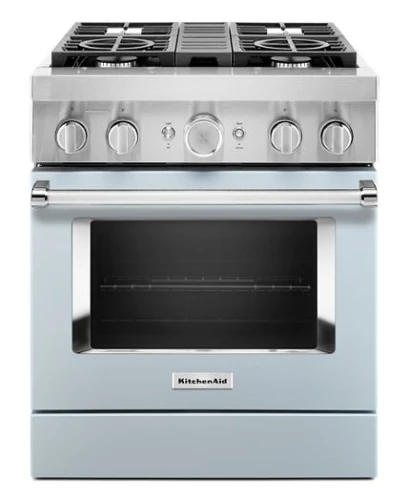 Empower your creativity with a 30-inch KitchenAid® Commercial Style Range with 4 burners. This dual fuel range combines a gas cooktop with the even baking of an electric oven. Two versatile 20,000 BTU Ultra Power™ Dual-Flame Burners offer the power and precision to sear, simmer, stir-fry and sauté. Even-Heat™ True Convection helps you achieve more consistent baking and roasting.