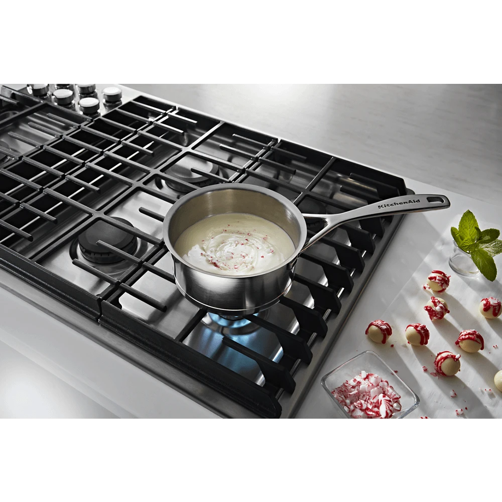 This 36 gas cooktop includes Downdraft, an integrated ventilation system that doesn t require a separate hood. The cooktop features a 17K BTU professional burner to achieve both high heat needed for searing and low simmer settings. The 5K BTU Even-Heat™ Simmer Burner enables precise simmering and melting while the 300 CFM exhaust rating means the venting can handle it all.
