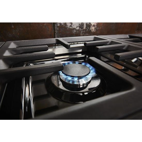 Expand your skills with a 36-inch KitchenAid® Commercial Style Range with 6 burners. This dual fuel range combines a gas cooktop with the even baking of an electric oven. Two 20,000 BTU Ultra Power™ Dual-Flame Burners offer the power and precision to successfully sear, simmer, stir-fry and sauté. Even-Heat™ True Convection helps you achieve more consistent baking and roasting.